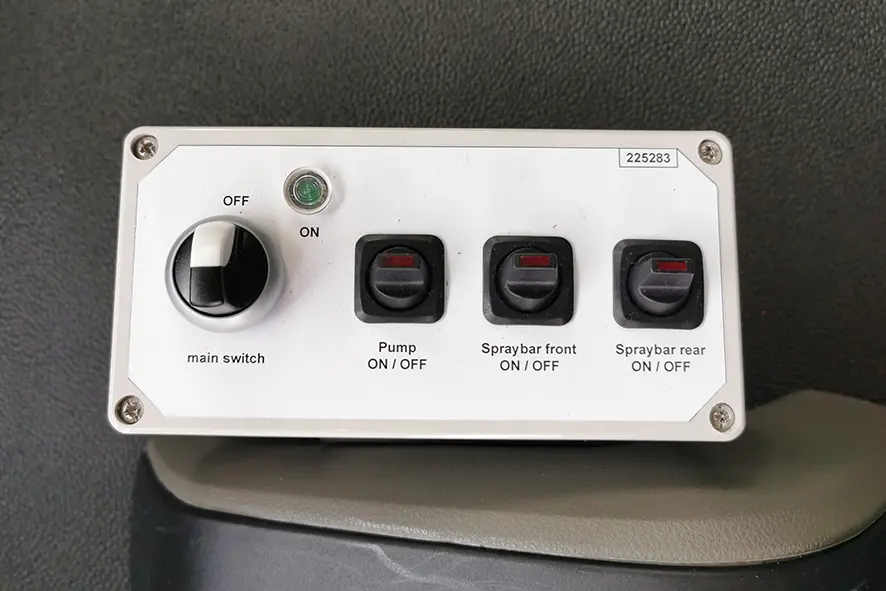Front and rear mounted spray bar with two special fan-nozzles (frog-type) pressure working