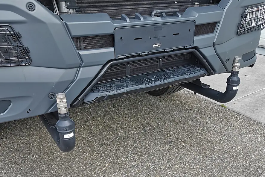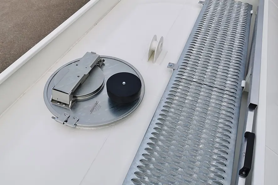 Open mesh walkway on the right-hand side of the manhole cover, with rear mounted foldable access ladder.